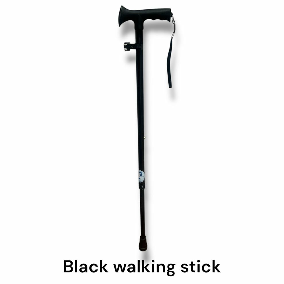 1. Black walking stick: This stick has an ergonomic rubber handle. Floor to handle height range 73.5-98cm.
