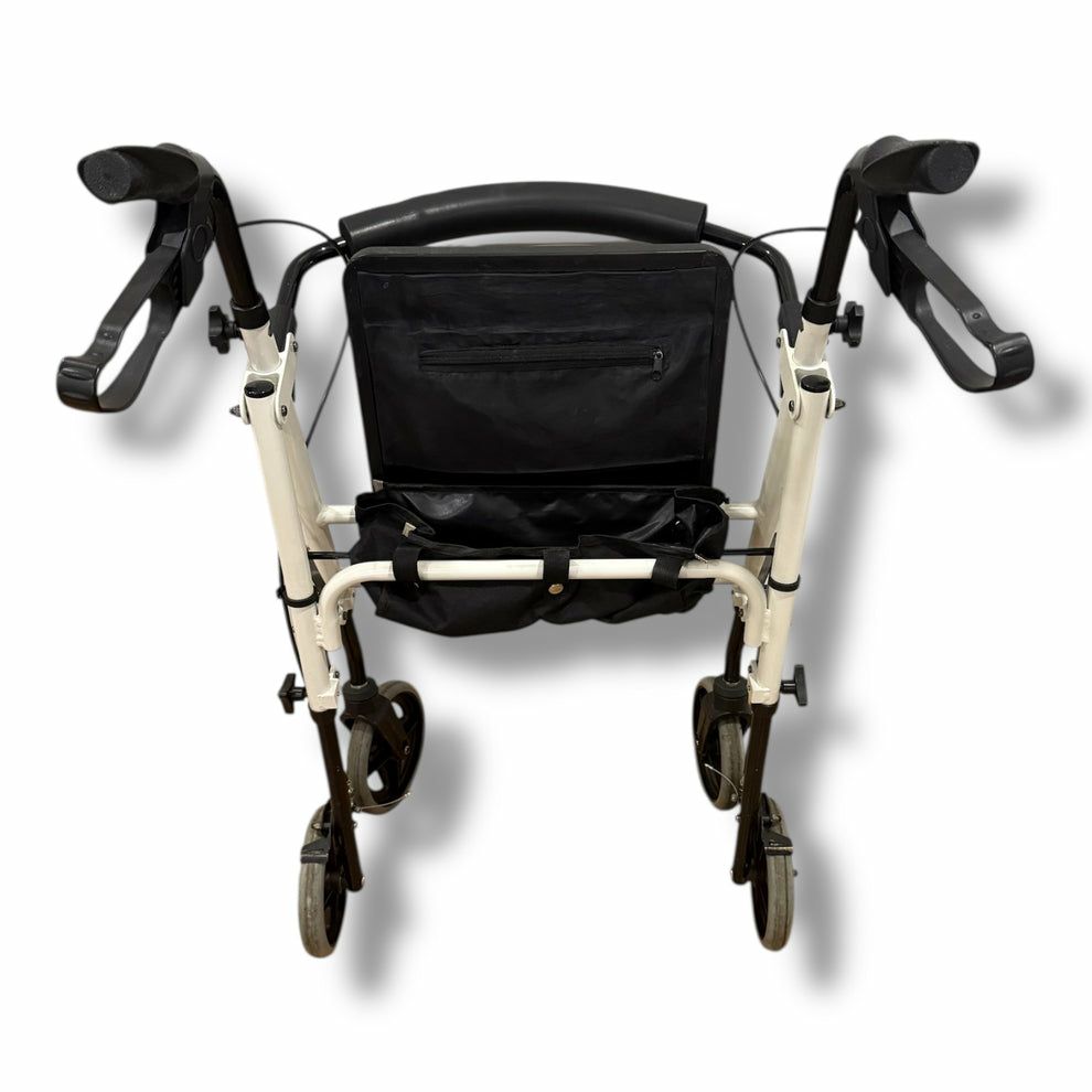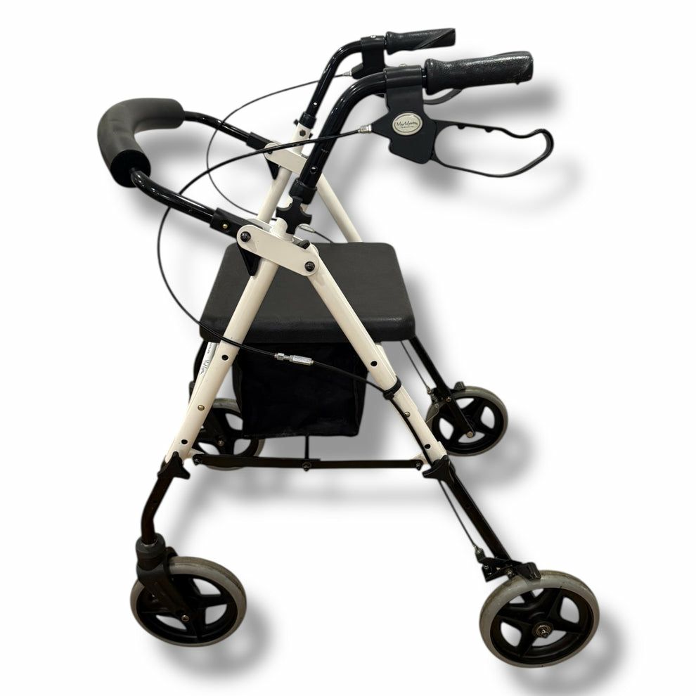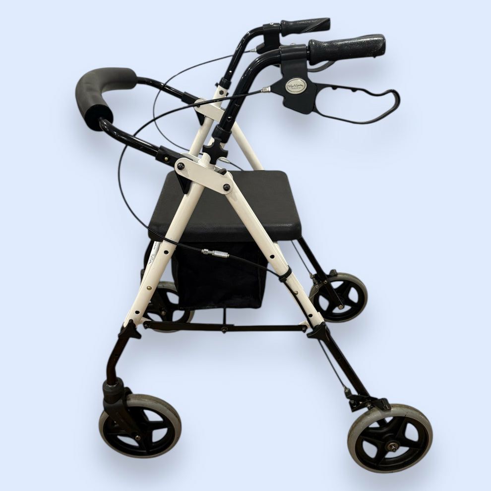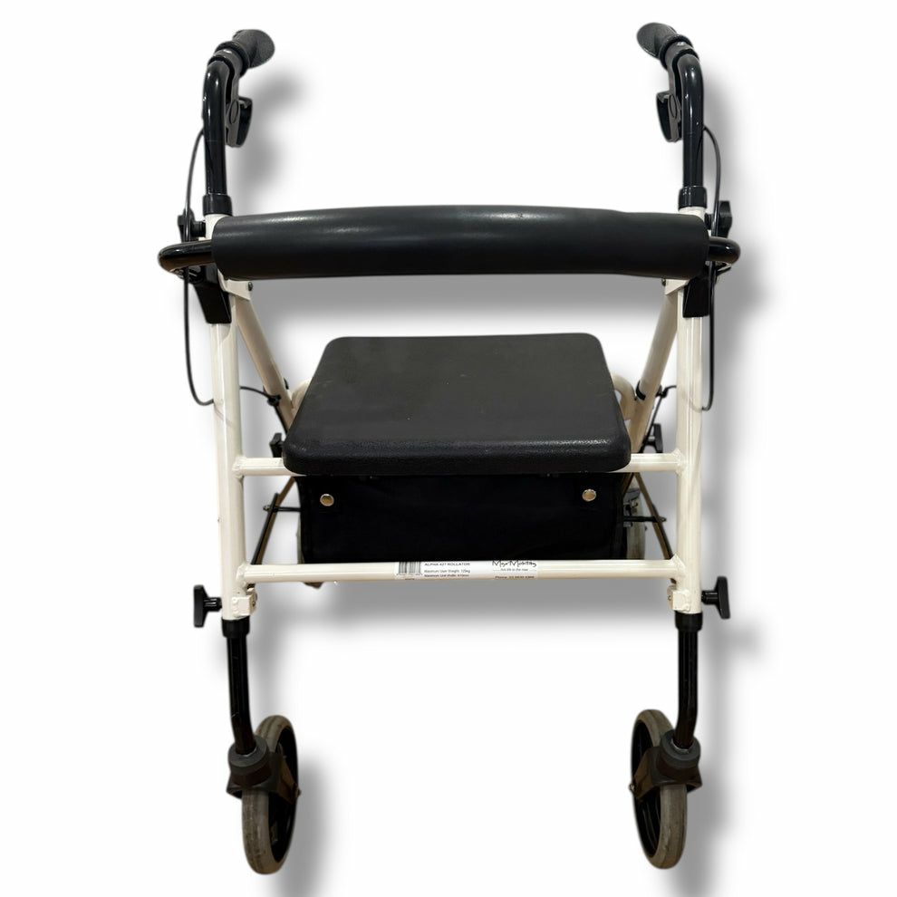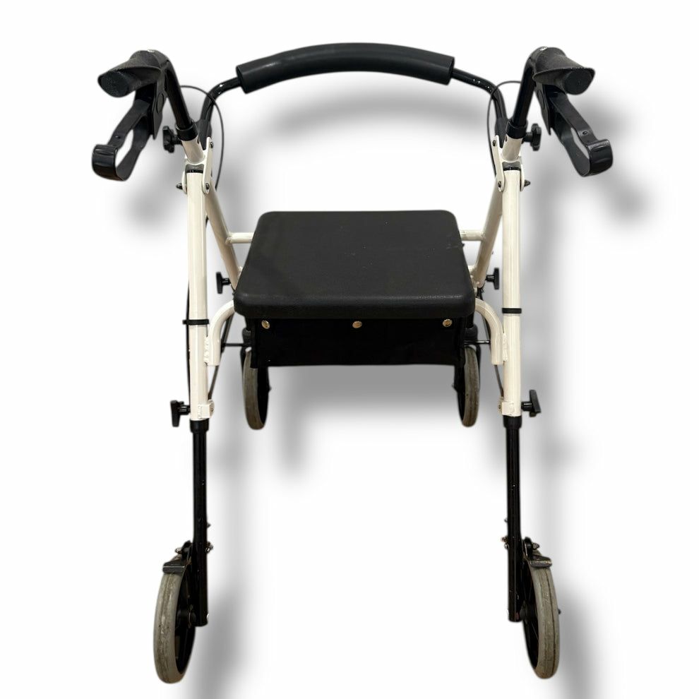 This four-wheel walker is in good condition with some slight signs of prior use. The brakes and wheels have been serviced and are in good working order. It has been cleaned and sanitized, ready for its next user.